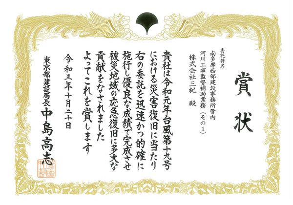 - 表彰名:東京都建設局災害復旧等功労者表彰